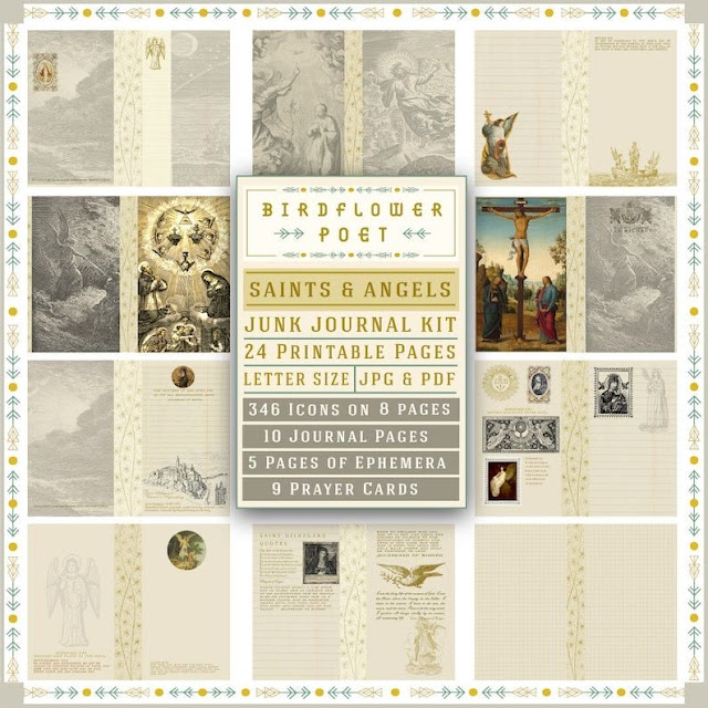 Saints & Angels printable journal kit with 24 printable pages of religious ephemera. 10 journal pages to be folded into 5.5 x 8.5 inches to make a 20 page journal. 346 icons on 8 pages in JPG and PDF format. 8 prayer cards that are 2 x 3 inches.